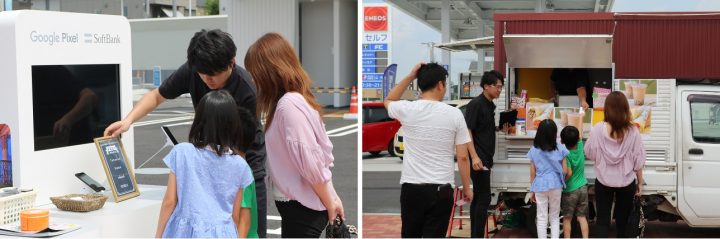 イベントでは、施設中央にある広場にケータリングカー2台を配置。『Google Pixel 3a』を体験していただいたお客様に無料でタピオカやタコ焼きなどを差し上げました。