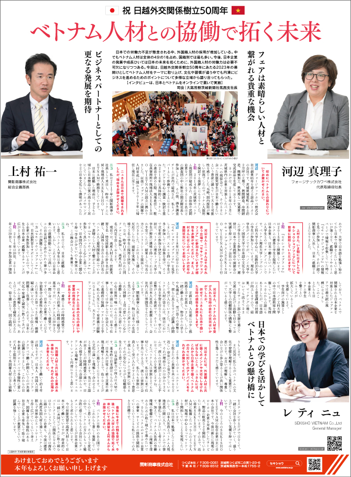 「ベトナム人材との協働で拓く未来」をテーマに、フォージテックカワベ株式会社 代表取締役社長 河辺 真理子様、関彰商事株式会社 総合企画部長 上村祐一、SEKISHO VIETNAM Co.,Ltd. General Manager レ ティ ニュの3名による鼎談記事となっております。